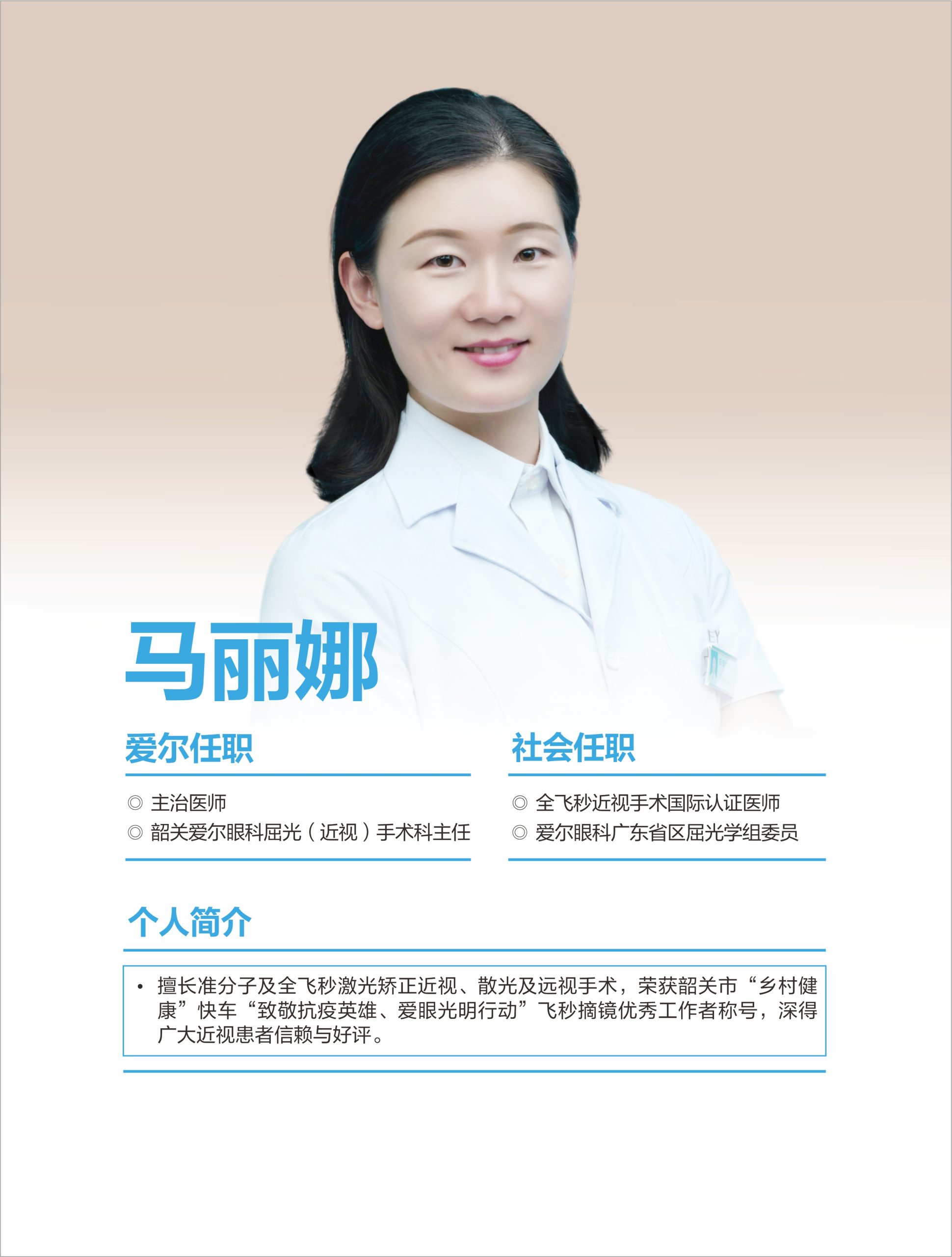 屈光近視矯正中心是韶關(guān)愛爾眼科醫(yī)院有限公司的重點科室,由中國衛(wèi)生行業(yè)標(biāo)準(zhǔn)《準(zhǔn)分子激光角膜屈光手術(shù)質(zhì)量控制》起草人、博士生導(dǎo)師王錚教授領(lǐng)銜,王愛琴副院長親自掛帥,醫(yī)師馬麗娜等人組成一支技術(shù)精湛的近視矯正團隊,全面開展各類屈光手術(shù)。該科室具備矯正近視的全解決能力,開展超10種近視術(shù)式:飛秒激光、ICL晶體植入術(shù)等,全面矯正1800度內(nèi)近視以及600度內(nèi)散光。